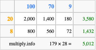 Below is an illustration showing you how to calculate 179 times 28 using the box method, using the instructions above.