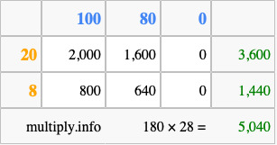 That's all there is to it! As you can see from the box above, the answer to 180 times 28 using the box method is 5,040.