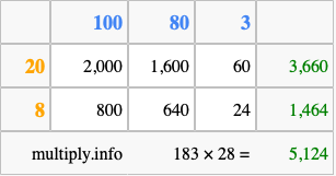 That's all there is to it! As you can see from the box above, the answer to 183 times 28 using the box method is 5,124.