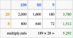 That's all there is to it! As you can see from the box above, the answer to 189 times 28 using the box method is 5,292.