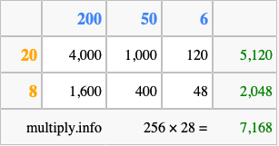That's all there is to it! As you can see from the box above, the answer to 256 times 28 using the box method is 7,168.