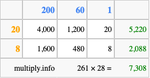 Finally, we add up all the sums we found in step 3 to get our final answer to 261 times 28.