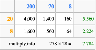 That's all there is to it! As you can see from the box above, the answer to 278 times 28 using the box method is 7,784.
