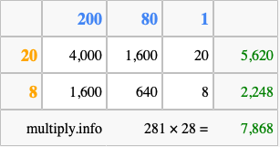 Finally, we add up all the sums we found in step 3 to get our final answer to 281 times 28.