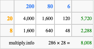 That's all there is to it! As you can see from the box above, the answer to 286 times 28 using the box method is 8,008.
