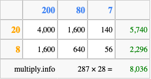 Finally, we add up all the sums we found in step 3 to get our final answer to 287 times 28.