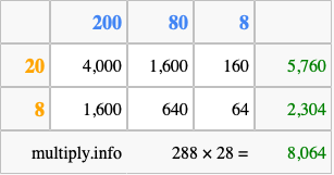 Finally, we add up all the sums we found in step 3 to get our final answer to 288 times 28.