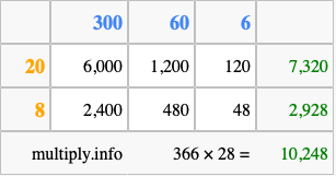 Below is an illustration showing you how to calculate 366 times 28 using the box method, using the instructions above.