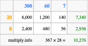 That's all there is to it! As you can see from the box above, the answer to 367 times 28 using the box method is 10,276.