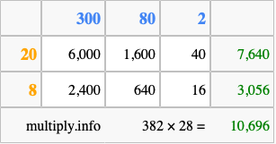 That's all there is to it! As you can see from the box above, the answer to 382 times 28 using the box method is 10,696.