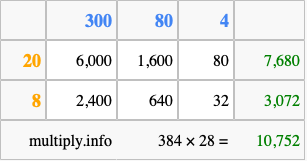 Finally, we add up all the sums we found in step 3 to get our final answer to 384 times 28.