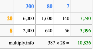 Finally, we add up all the sums we found in step 3 to get our final answer to 387 times 28.