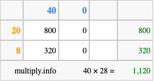 That's all there is to it! As you can see from the box above, the answer to 40 times 28 using the box method is 1,120.