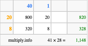 That's all there is to it! As you can see from the box above, the answer to 41 times 28 using the box method is 1,148.