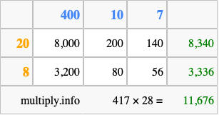 Finally, we add up all the sums we found in step 3 to get our final answer to 417 times 28.