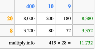Below is an illustration showing you how to calculate 419 times 28 using the box method, using the instructions above.