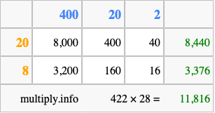 Below is an illustration showing you how to calculate 422 times 28 using the box method, using the instructions above.