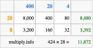 That's all there is to it! As you can see from the box above, the answer to 424 times 28 using the box method is 11,872.