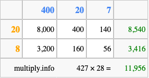 Finally, we add up all the sums we found in step 3 to get our final answer to 427 times 28.