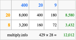 That's all there is to it! As you can see from the box above, the answer to 429 times 28 using the box method is 12,012.