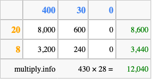 Below is an illustration showing you how to calculate 430 times 28 using the box method, using the instructions above.