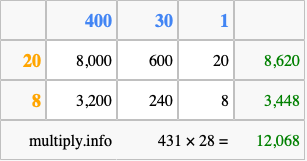 That's all there is to it! As you can see from the box above, the answer to 431 times 28 using the box method is 12,068.