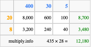 Below is an illustration showing you how to calculate 435 times 28 using the box method, using the instructions above.