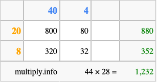 Finally, we add up all the sums we found in step 3 to get our final answer to 44 times 28.