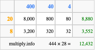 That's all there is to it! As you can see from the box above, the answer to 444 times 28 using the box method is 12,432.