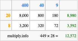That's all there is to it! As you can see from the box above, the answer to 449 times 28 using the box method is 12,572.