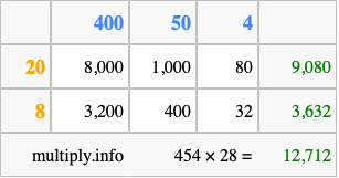 That's all there is to it! As you can see from the box above, the answer to 454 times 28 using the box method is 12,712.