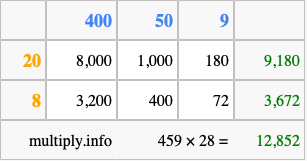 That's all there is to it! As you can see from the box above, the answer to 459 times 28 using the box method is 12,852.