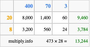Finally, we add up all the sums we found in step 3 to get our final answer to 473 times 28.