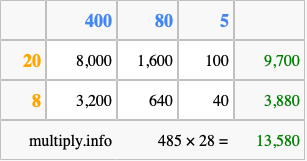 Finally, we add up all the sums we found in step 3 to get our final answer to 485 times 28.