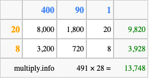 That's all there is to it! As you can see from the box above, the answer to 491 times 28 using the box method is 13,748.
