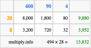 That's all there is to it! As you can see from the box above, the answer to 494 times 28 using the box method is 13,832.