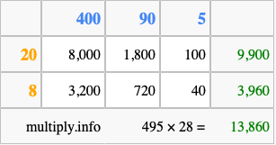 That's all there is to it! As you can see from the box above, the answer to 495 times 28 using the box method is 13,860.