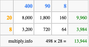 That's all there is to it! As you can see from the box above, the answer to 498 times 28 using the box method is 13,944.