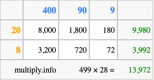That's all there is to it! As you can see from the box above, the answer to 499 times 28 using the box method is 13,972.