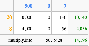 That's all there is to it! As you can see from the box above, the answer to 507 times 28 using the box method is 14,196.