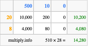 Below is an illustration showing you how to calculate 510 times 28 using the box method, using the instructions above.