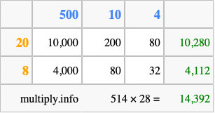 Below is an illustration showing you how to calculate 514 times 28 using the box method, using the instructions above.