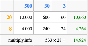That's all there is to it! As you can see from the box above, the answer to 533 times 28 using the box method is 14,924.