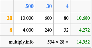 Below is an illustration showing you how to calculate 534 times 28 using the box method, using the instructions above.