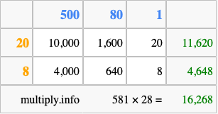 Finally, we add up all the sums we found in step 3 to get our final answer to 581 times 28.