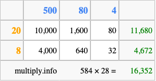 Below is an illustration showing you how to calculate 584 times 28 using the box method, using the instructions above.