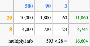 Below is an illustration showing you how to calculate 593 times 28 using the box method, using the instructions above.