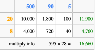 Below is an illustration showing you how to calculate 595 times 28 using the box method, using the instructions above.