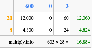That's all there is to it! As you can see from the box above, the answer to 603 times 28 using the box method is 16,884.