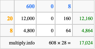 That's all there is to it! As you can see from the box above, the answer to 608 times 28 using the box method is 17,024.